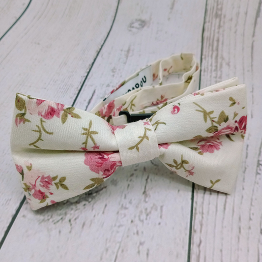 Nœud papillon Blanc motifs fleuris tons rose Papa et Enfant 100% Coton